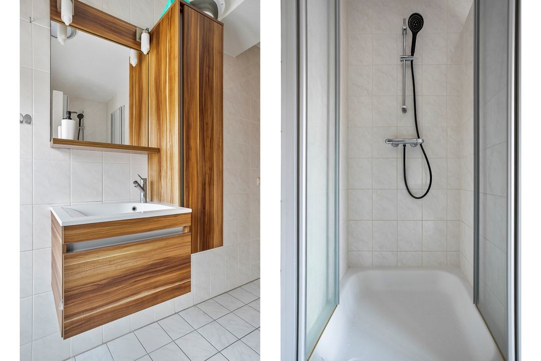 De badkamer beschikt over een douchecabine en een wastafelmeubel met extra opbergruimte – perfect voor ontspannende momenten na een lange dag. Daarnaast is er een aparte toiletruimte met een hangend toilet en fonteintje, wat zorgt voor extra gemak en privacy.