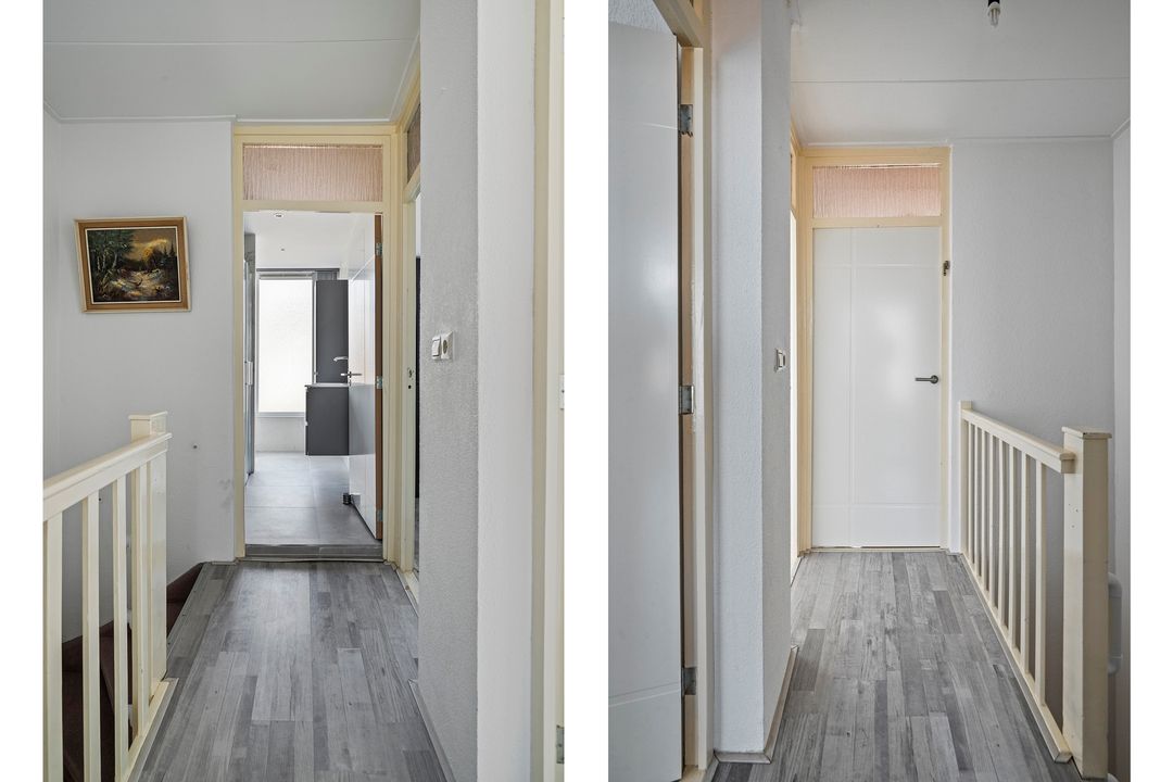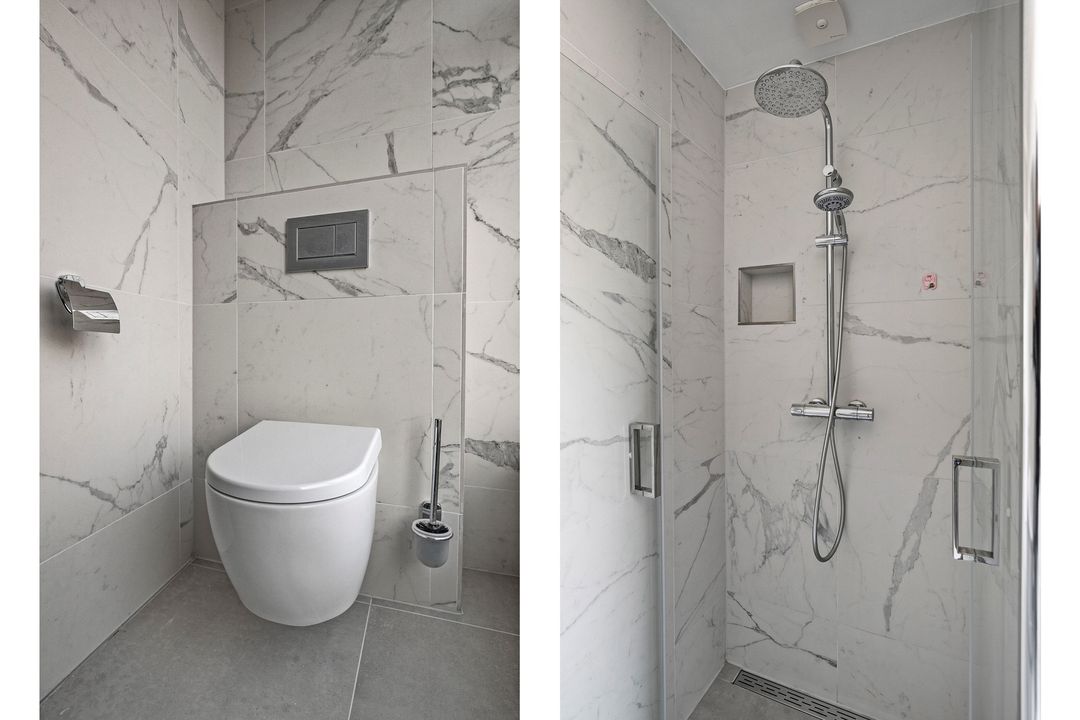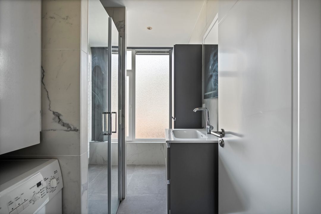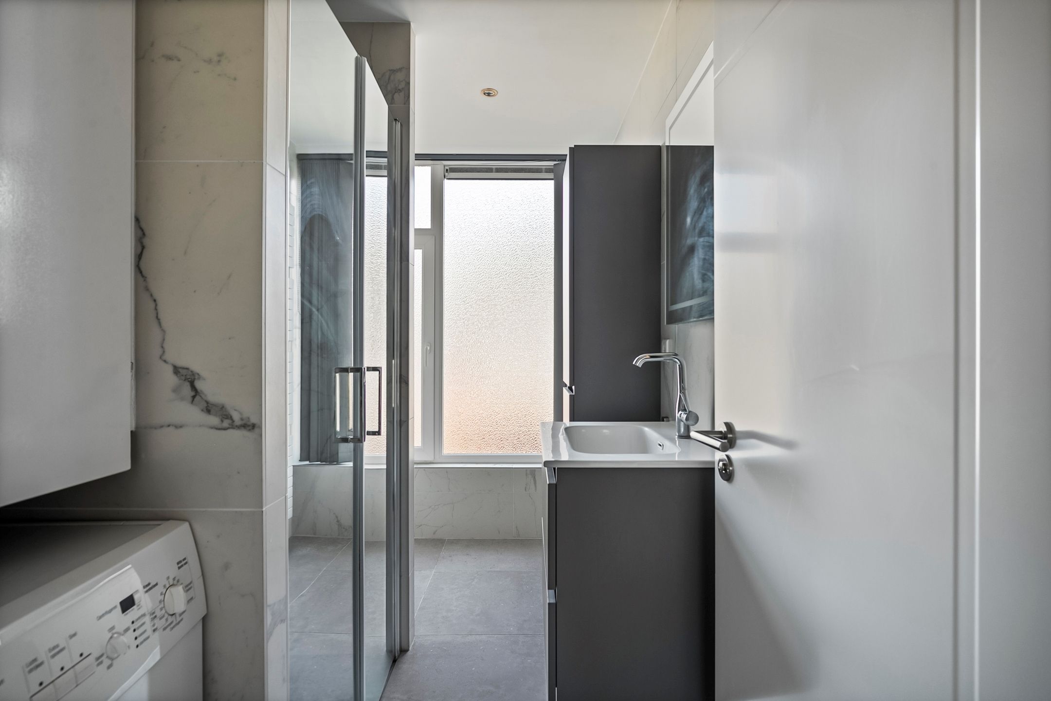 De overloop geeft toegang tot drie goed bemeten slaapkamers en een luxe, vernieuwde badkamer (2022). Deze is uitgerust met vloerverwarming, een ruime inloopdouche, modern wastafelmeubel, hangend toilet en aansluiting voor de wasmachine.