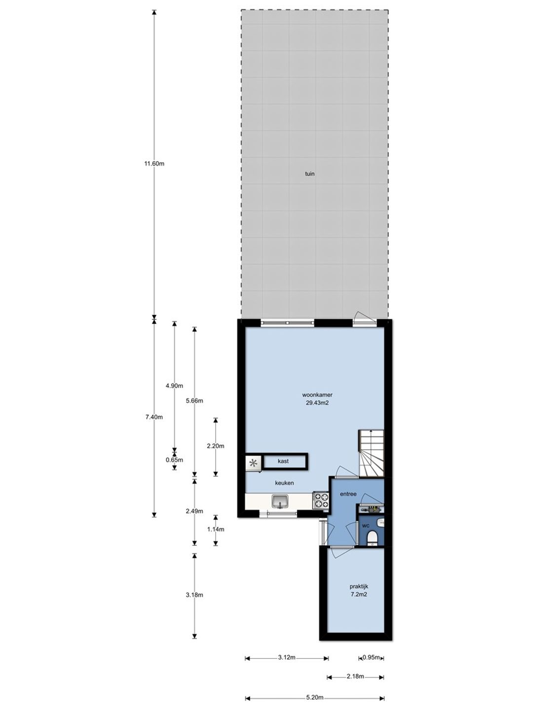 Via de entree bereikt u de hal met het toilet en de meterkast en de praktijkruimte. De praktijkruimte is ca. 7.2m2 groot en is voorzien van elektra en verwarming.