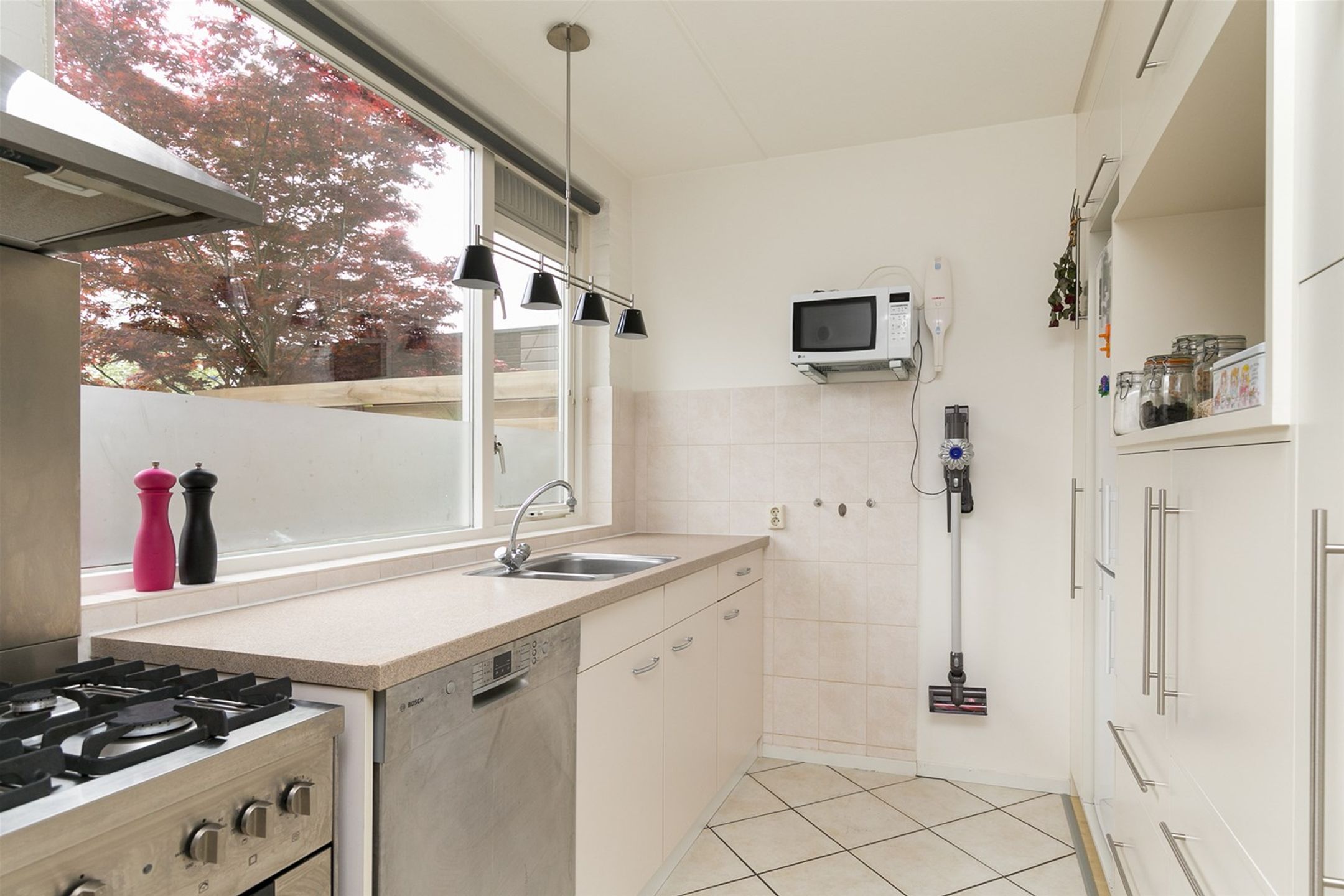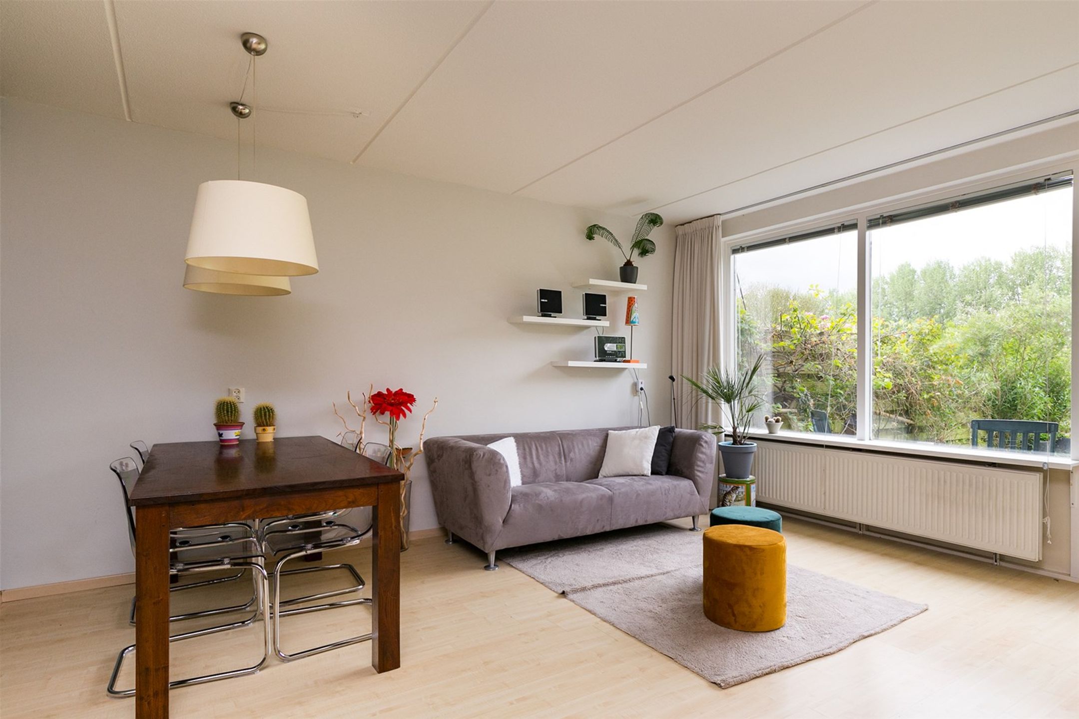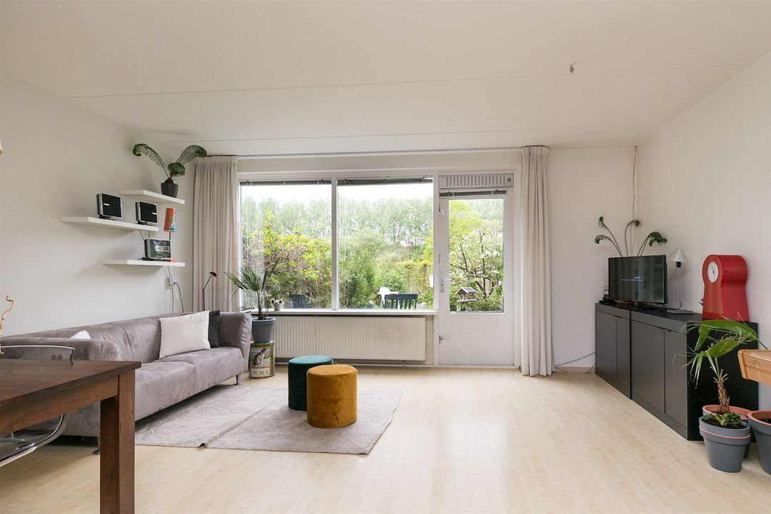 De woonkamer met een openslaande deur is heerlijk licht en heeft uitzicht op de royale achtertuin. De achtertuin is ca. 11 meter diep en grenst aan een groenvoorziening met water.