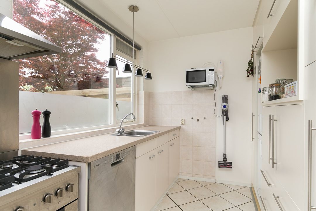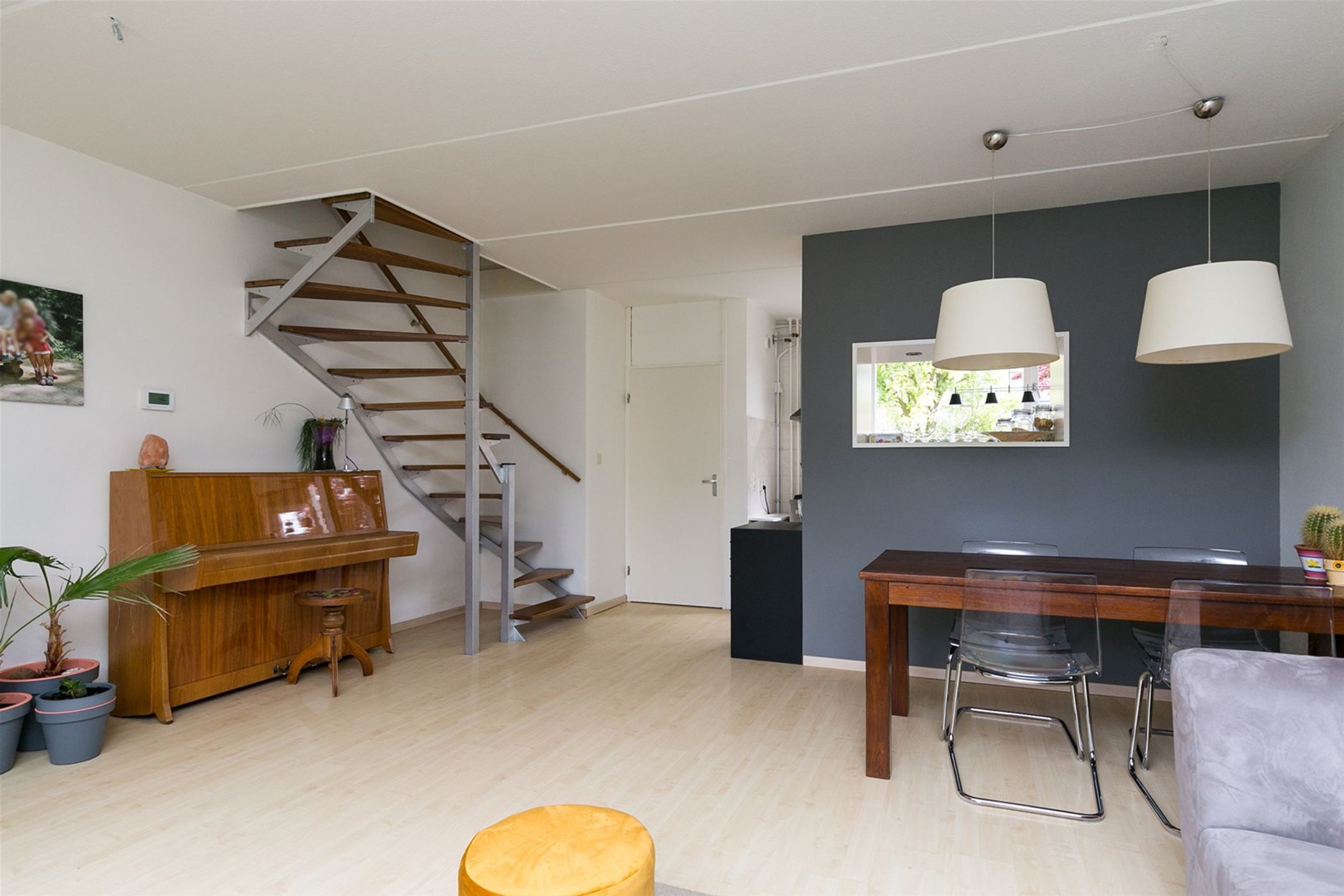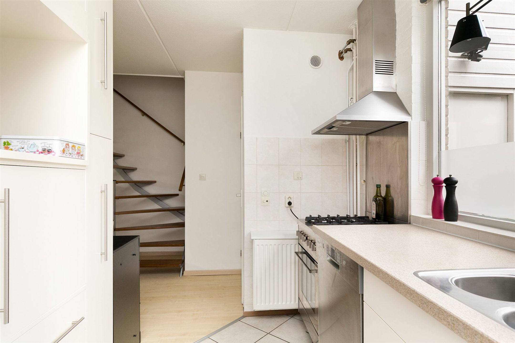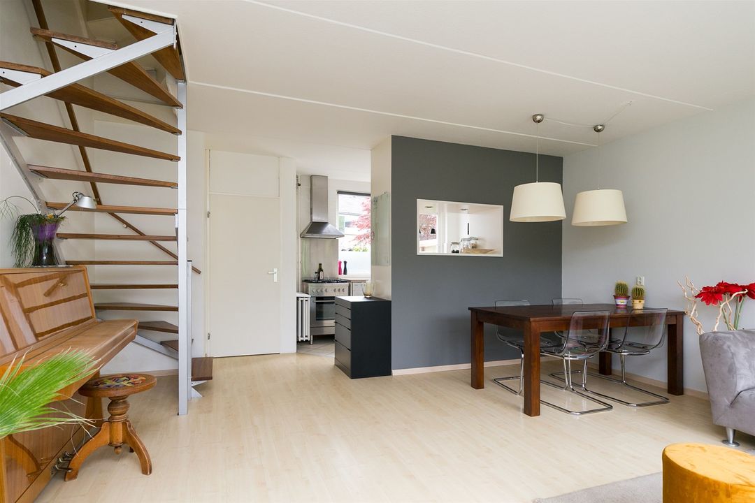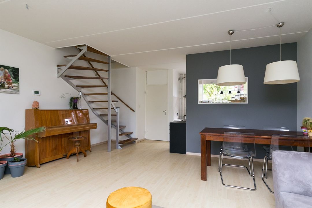 De woonkamer is voorzien van licht en strak afgewerkte muren en een lichte laminaat vloer. De halfopen keuken ligt aan de voorzijde van de woning De keuken is voorzien van een gasfornuis met oven en een afzuigkap. Middels de open trap in de woonkamer bereikt u de eerste verdieping.