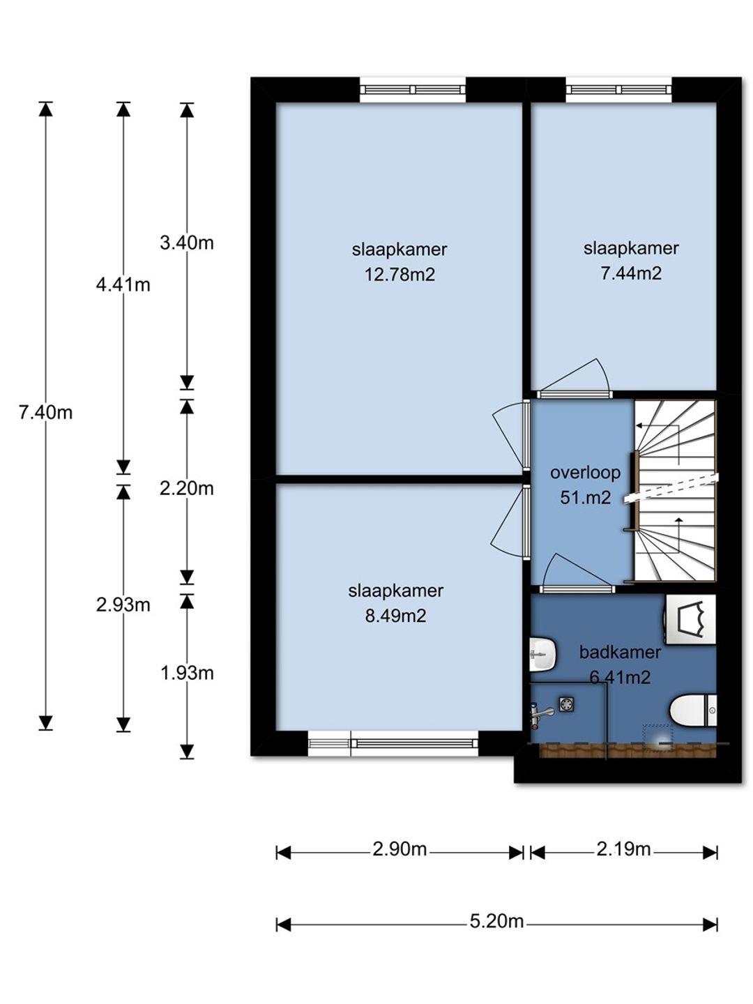 Overloop met toegang naar de badkamer en 3 slaapkamers. De badkamer is voorzien van een douchecabine, wastafel en een toilet. In de badkamer is de aansluiting van de wasmachine aanwezig die overigens ook op de zolderverdieping aanwezig is. Aan de voorzijde van de woning treft u 1 slaapkamer van ca. 8.49m2 met wastafel. Aan de achterzijde bevinden zich 2 slaapkamer van ca 12.78m2 en 7.44m2. Middels een trap bereikt u de tweede verdieping.