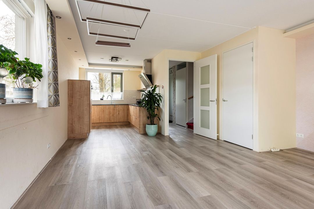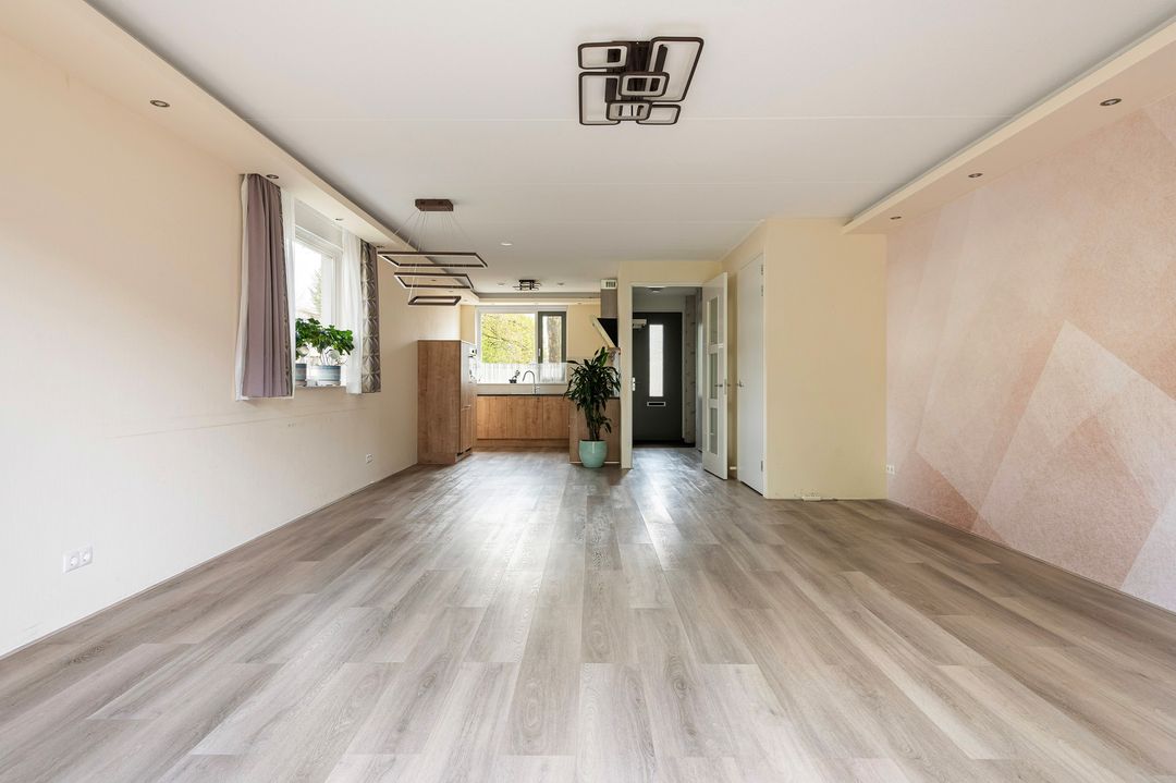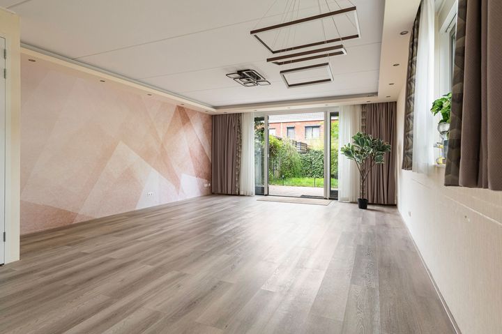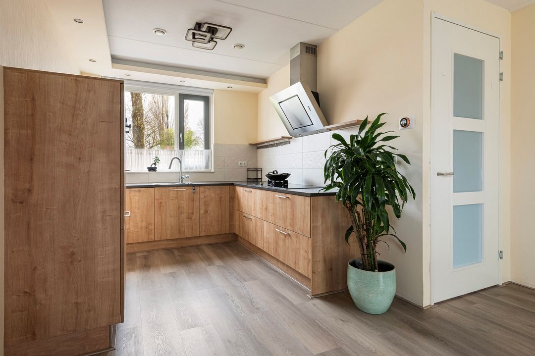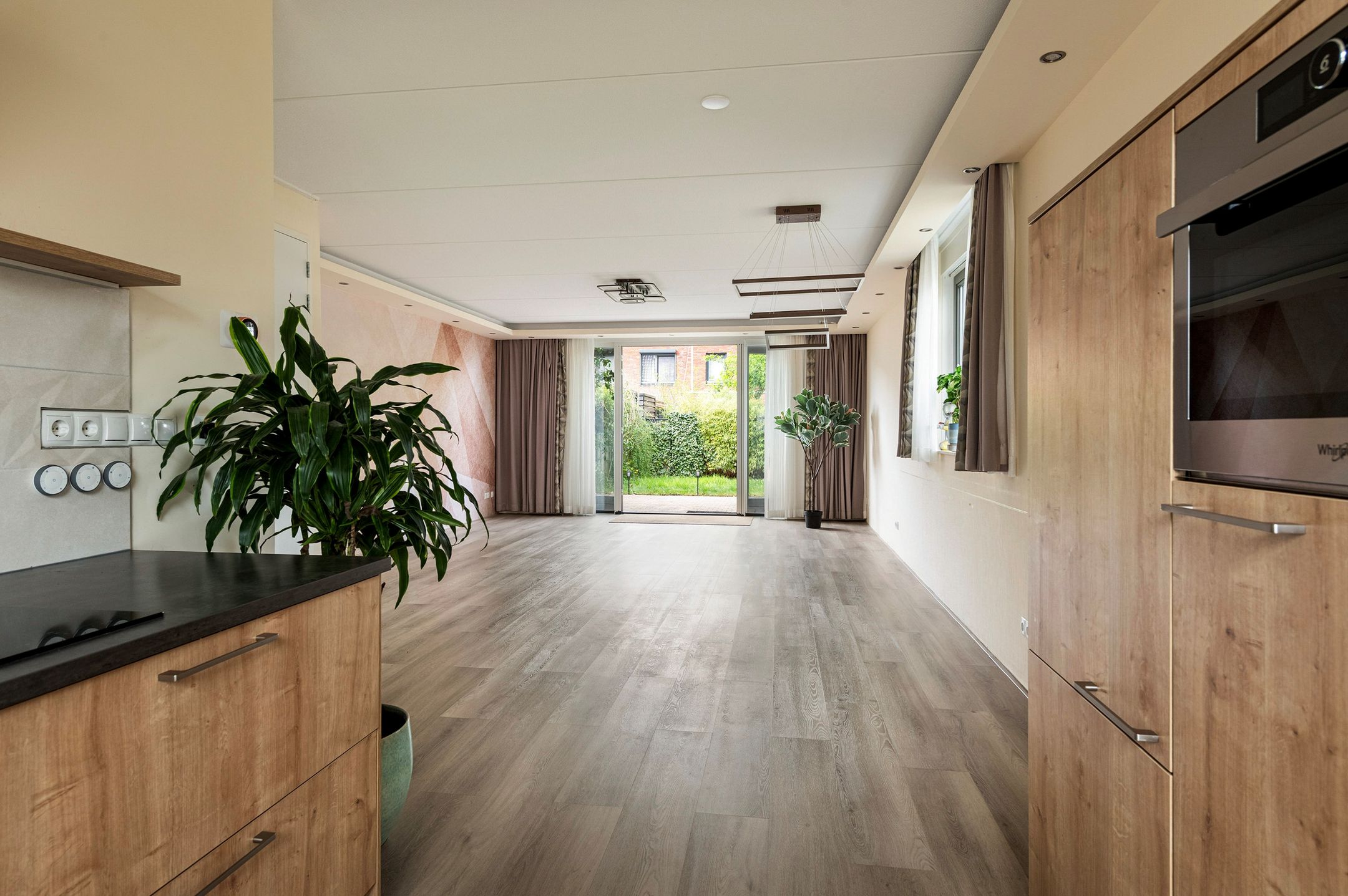 Begane grond: een nette voortuin leidt naar de entree en een ruime hal met toegang tot een toilet, de meterkast en de trap naar eerste verdieping. De uitgebouwde ruime woonkamer is tuingericht met openslaande deuren naar de achtertuin. Het raam aan de zijkant van de woning zorgt voor veel extra lichtinval. De open keuken aan de voorzijde beschikt onder meer over een vaatwasser, een inductiekookplaat, een afzuigkap en een inbouwoven. De hele benedenverdieping is voorzien van een lichte, onderhoudsarme laminaatvloer.