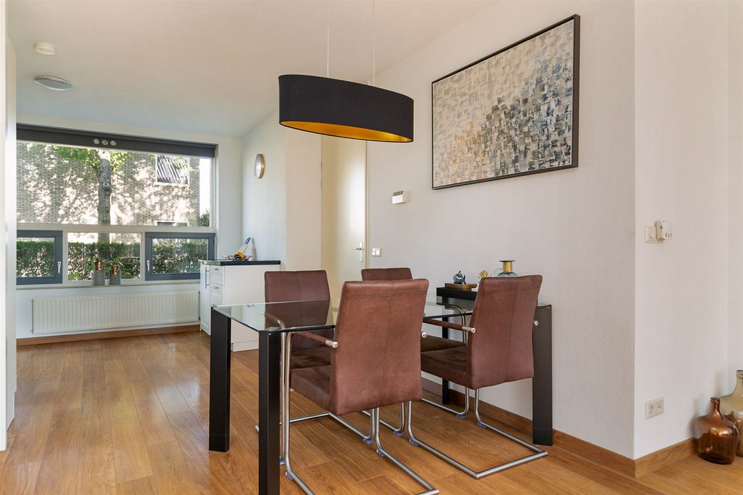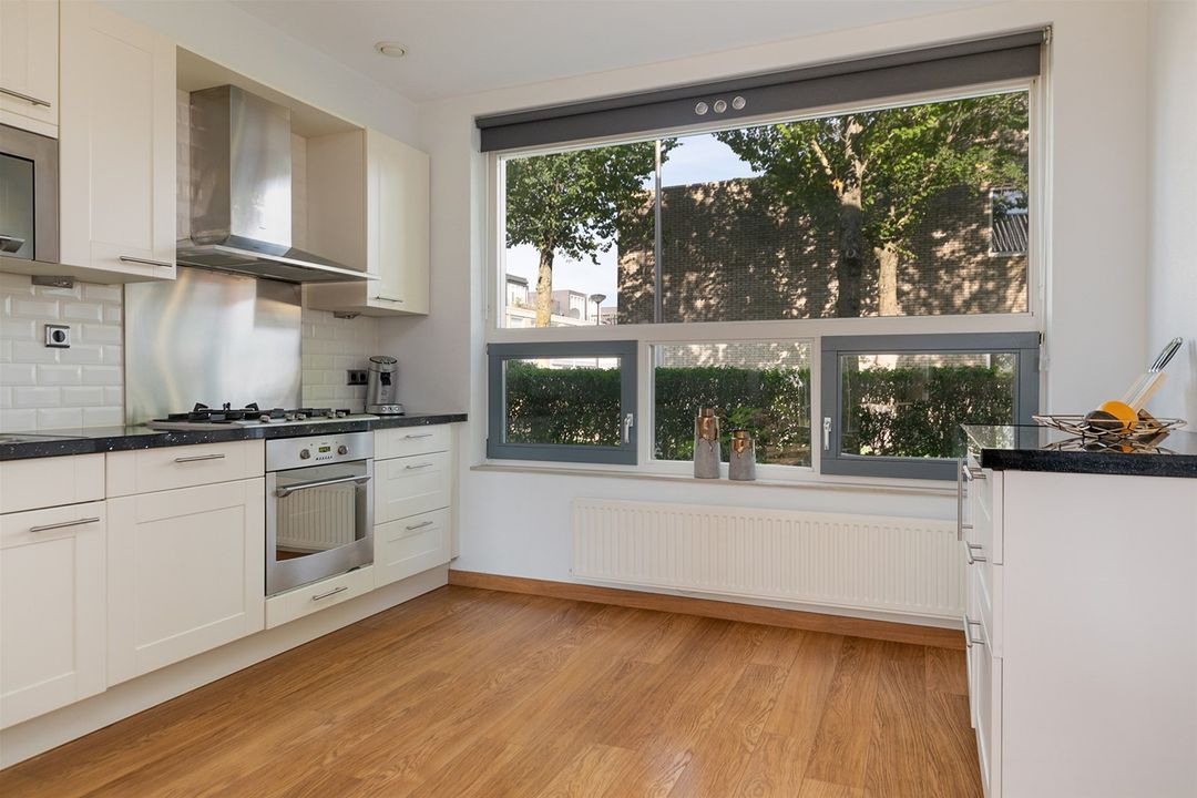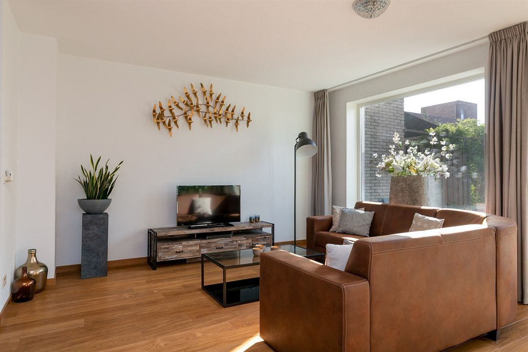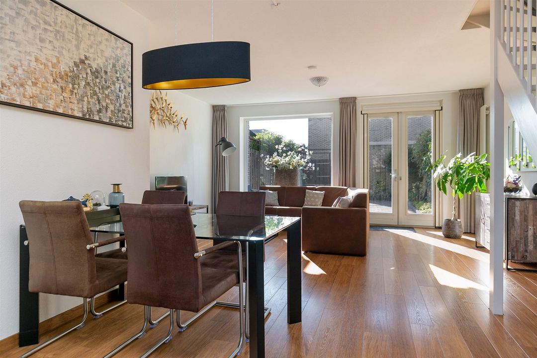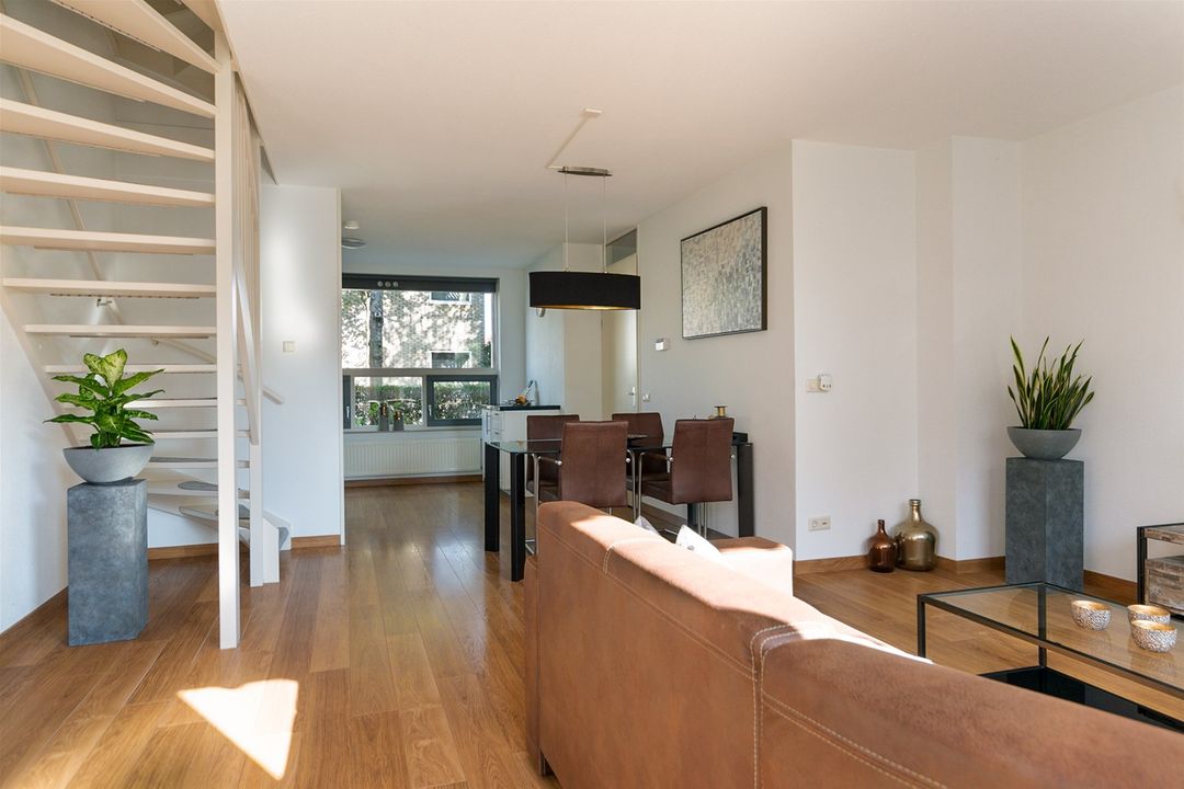 Begane grond; entreehal met meterkast, toegang naar hangend toilet en fontein, Via de hal toegang tot de woonkamer met open keuken, die zich aan de voorzijde van de woning bevindt. De zeer nette woonkamer is ca 23.3 m2 groot en is voorzien van 2 openslaande deuren naar de tuin. In de woonkamer is de open trap gesitueerd. De zeer nette keuken is voorzien van diverse inbouw apparatuur zoals oven, magnetron, afzuigkap vaatwasser, 5 pits kookplaat incl. wok, koelkast en vriezer. Daarnaast beschikt de keuken over een composiet werkblad. De gehele begane grond is voorzien van een hoogwaardige laminaat vloer.