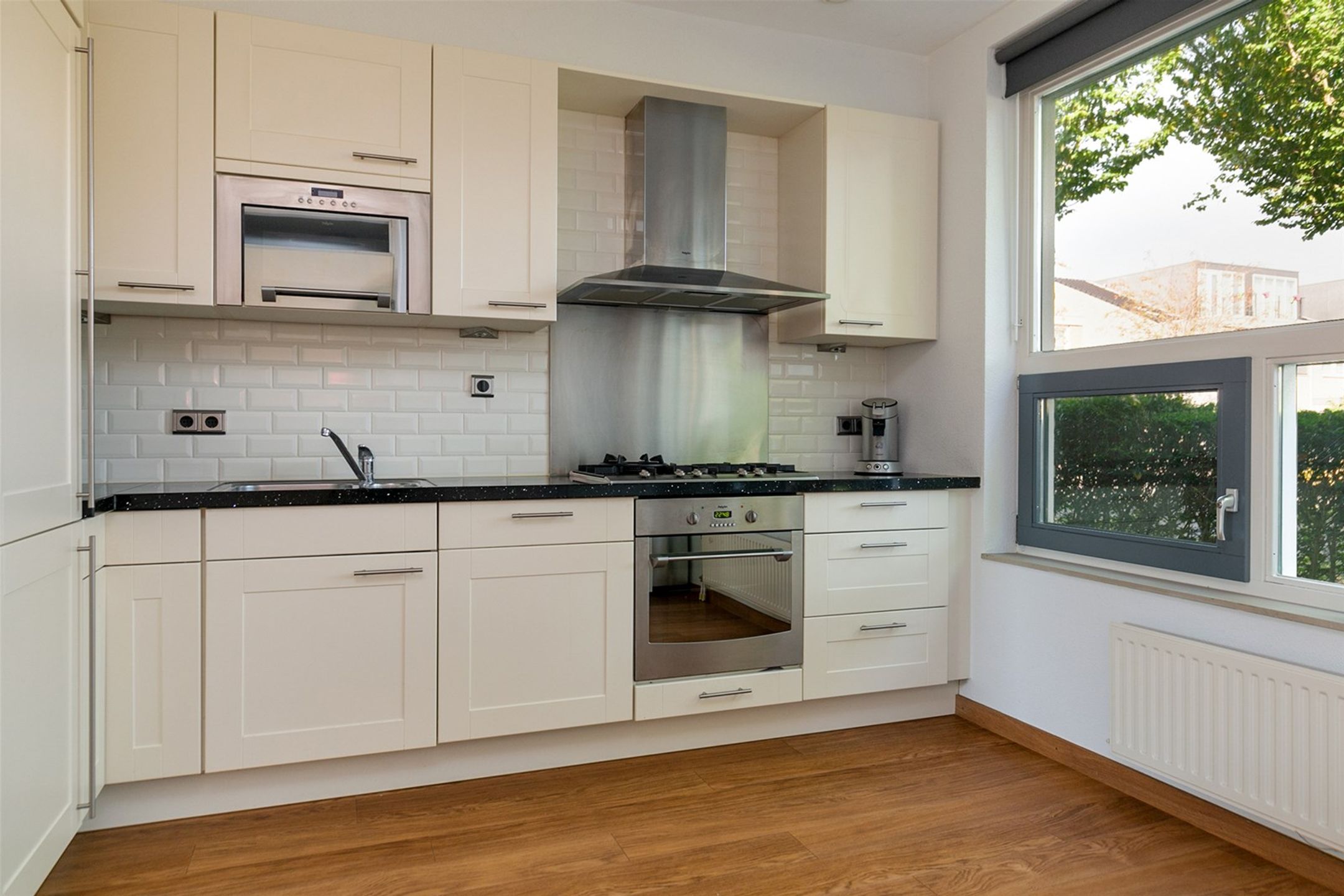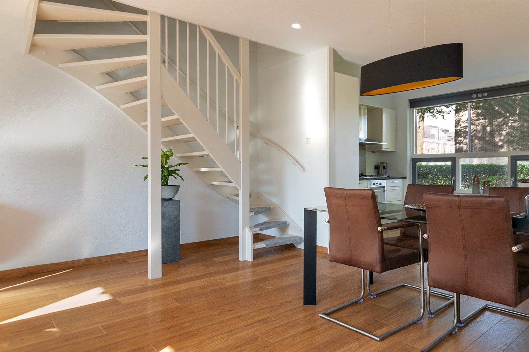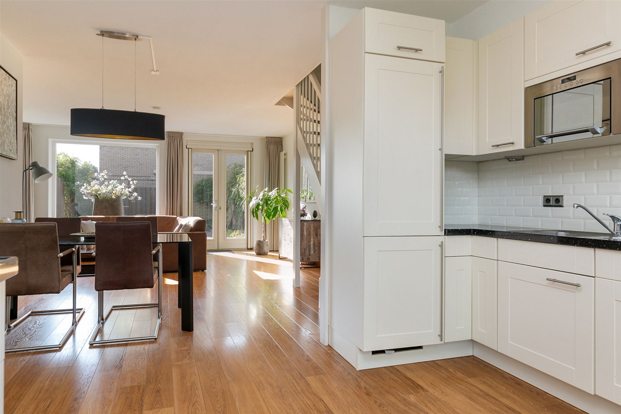 Begane grond; entreehal met meterkast, toegang naar hangend toilet en fontein, Via de hal toegang tot de woonkamer met open keuken, die zich aan de voorzijde van de woning bevindt. De zeer nette woonkamer is ca 23.3 m2 groot en is voorzien van 2 openslaande deuren naar de tuin. In de woonkamer is de open trap gesitueerd. De zeer nette keuken is voorzien van diverse inbouw apparatuur zoals oven, magnetron, afzuigkap vaatwasser, 5 pits kookplaat incl. wok, koelkast en vriezer. Daarnaast beschikt de keuken over een composiet werkblad. De gehele begane grond is voorzien van een hoogwaardige laminaat vloer.