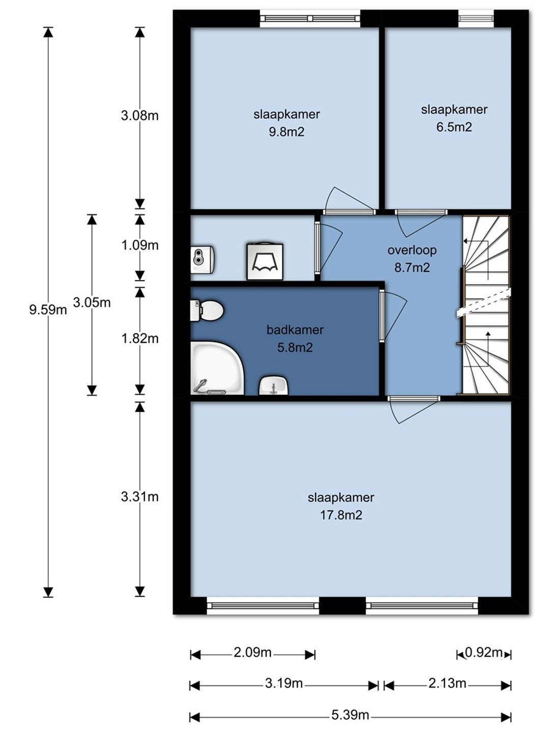 Eerste verdieping; via de trap bereikt u de overloop die toegang verschaft naar 3 slaapkamers, badkamer en een wasruimte. De eerste slaapkamer is gesitueerd aan de voorzijde van de woning en is ca.17.8m2 groot. De andere 2 slaapkamers liggen aan de achterzijde van de woning en zijn ca. 9.8m2 en 6.5m2 groot. De badkamer is voorzien van douche, toilet, wastafelmeubel en design radiator. Daarnaast beschikt deze verdieping over een aparte wasruimte met cv-opstelling en wasmachine aansluiting.